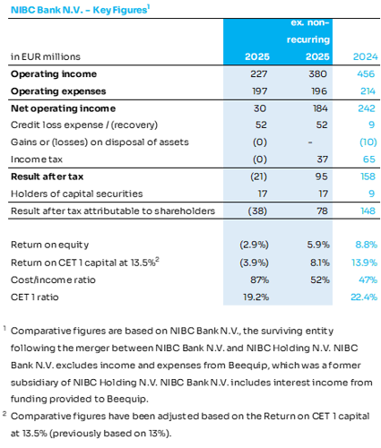 “2025 has been an extraordinary year for NIBC, the announced intended takeover by ABN AMRO and the sale of the non-core exposures have set the stage for the future of the company. During the year we continued to support our clients and succeeded in delivering resilient results, with a recurring result of EUR 78 million and a return on target CET1 capital of 8.1%. Our strong capital base is evidenced in our CET1 ratio of 19.2%, which includes the effects of Basel IV and the sale of our non-core portfolio. This year’s reported net loss of EUR 38 million is primarily due to the strategic divestment of non-core exposures, which resulted in a loss of EUR 116 million after tax recognised in operating income. Additionally, we see a deterioration of the credit quality of clients in our UK and German Fiber portfolio, leading to EUR 38 million in credit losses for the period (2024: EUR 6 million) in that specific part of the portfolio.